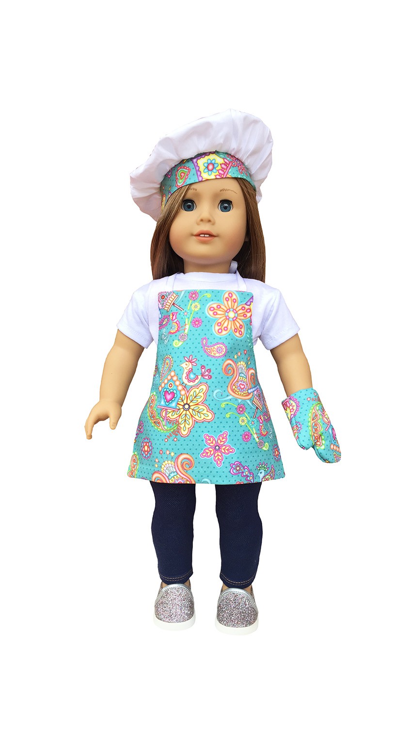 Kit contém 1 avental, 1 luva e um chapéu para bonecas de até 45cm como American Girl, Our Generation, e Baby Alive