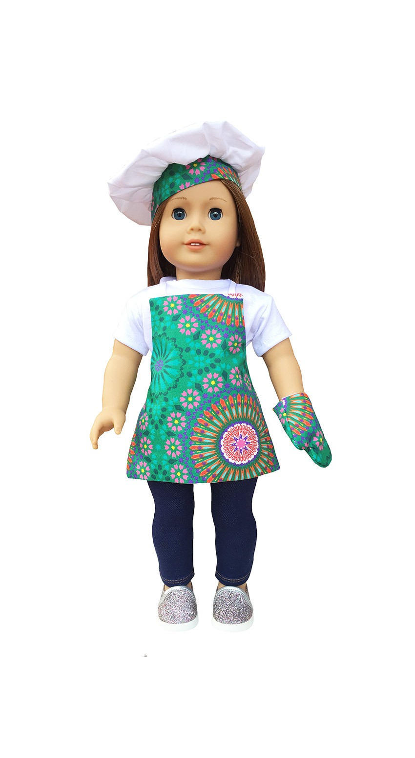 Kit contém 1 avental, 1 luva e um chapéu para bonecas de até 45cm como American Girl, Our Generation, e Baby Alive